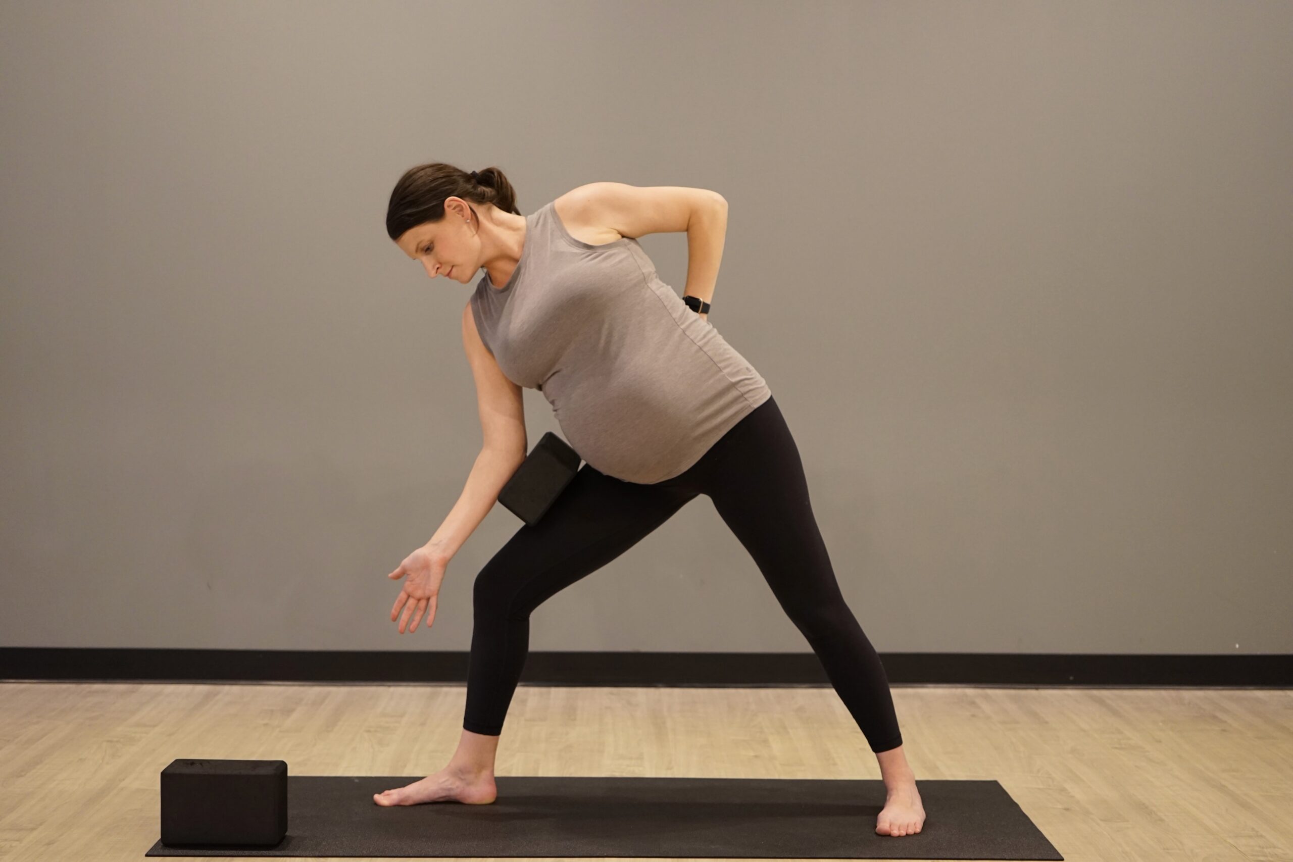 If you come to a yoga class it is a safe bet you will experience warrior II, extended side angle, and reverse warrior. You’ve likely heard the cue, “Create a 90 degree bend in your front leg” or, “Stack your knee over your front ankle.” As your pregnancy progresses you will actually want to come out of your front lunge a bit. The reason being? Your friend relaxin is preparing your body for birth, but results in looser hips and less pelvic stability. To provide more stability and avoid overdoing it, shorten your stance just a bit and give yourself permission to come out of the lunge. Be mindful of your front knee tracking inward. Tack your knee toward your front pinky toe. This will not only protect your knee, but will help strengthen your external hip rotators. In Extended Side Angle a block can feel amazing between your thigh and forearm. This will help create a little more space for baby and lengthen your side bodies.
