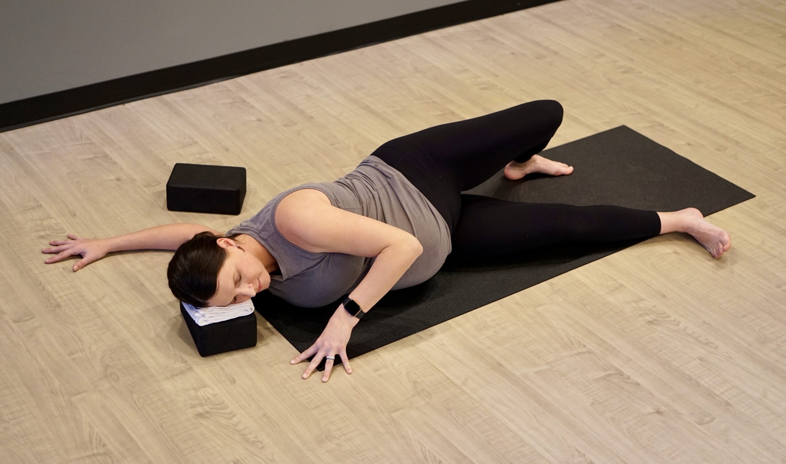 The vena cava is a major vein that brings blood to your heart. Into the 2nd and 3rd trimester when lying on your back, the baby can compress the vena cava making you feel dizzy or nauseous. So what about savasana? Some women are comfortable on their back for a few minutes, especially with blocks propped beneath their knees. If you feel nauseous or lightheaded though, this is not for you. A great alternative is to lie on your left side for savasana. Place a block beneath your cheek for a pillow and another block between your legs. If taking Restore, stack two blocks and lean your bolster along the blocks. Lie back on the ramp you have created for the most relaxing savasana ever!
