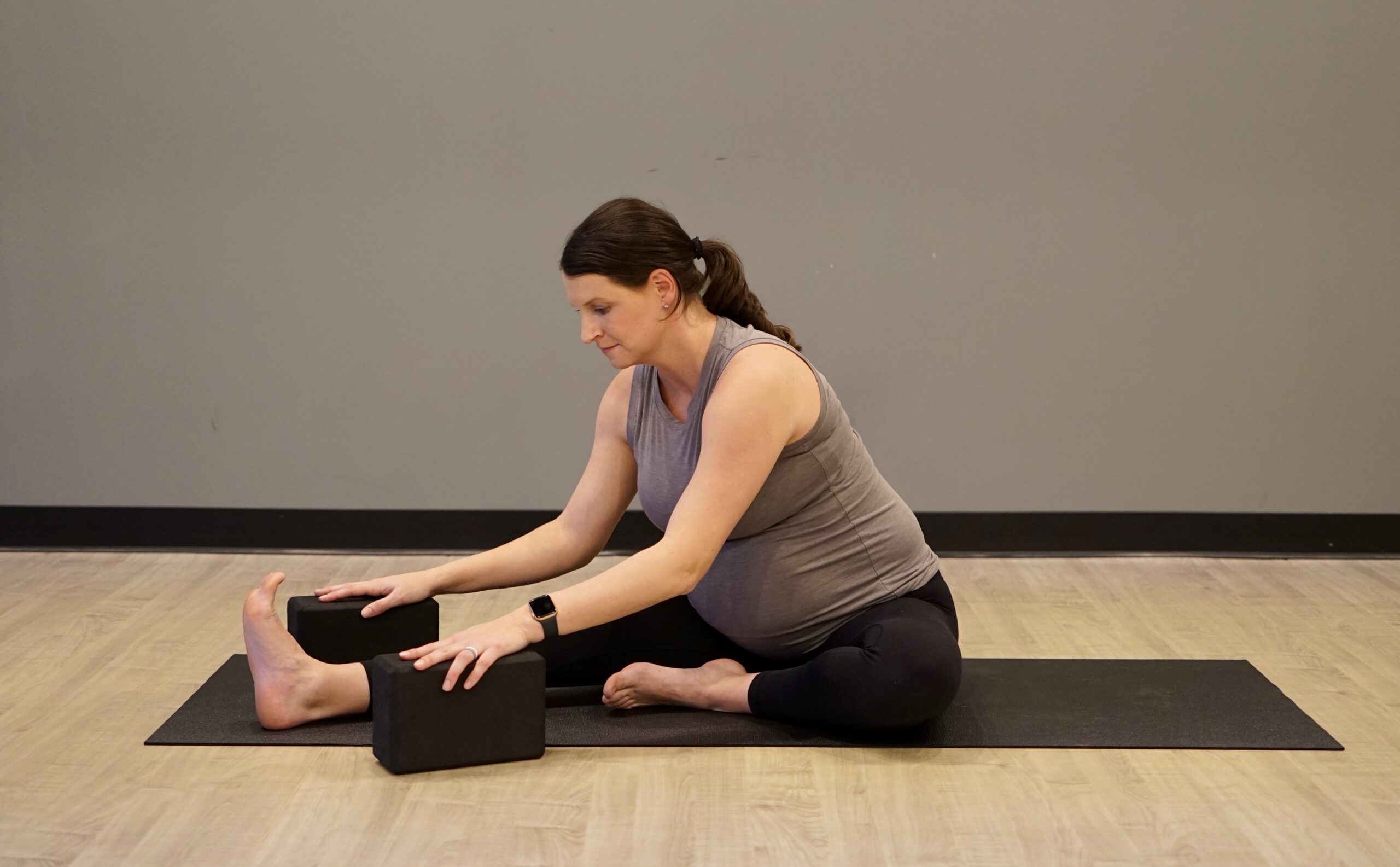 You will want to be mindful of overstretching during pregnancy. The body produces the hormone relaxin to loosen muscles, joints, and ligaments in preparation for birth. To avoid injury, be conscientious of your edge. Try to maintain the same range of motion you had pre-pregnancy. As your pregnancy progresses you may notice pelvic instability due to changes in weight and the added relaxin. We will explore slight adjustments within common postures to help keep you feeling at your best! Majority of pregnancy modifications come down to making room for baby and increasing stability. Baby will continue to grow, so our modifications will continue to evolve. A few postures that benefit from a wider stance include standing forward fold, halfway lift, downward facing dog,  mountain pose, child’s pose, ragdoll, and other postures in which you are hinging at the hips. As for seated forward fold, take a wide legged seated forward fold, butterfly, or janu sirsasana.