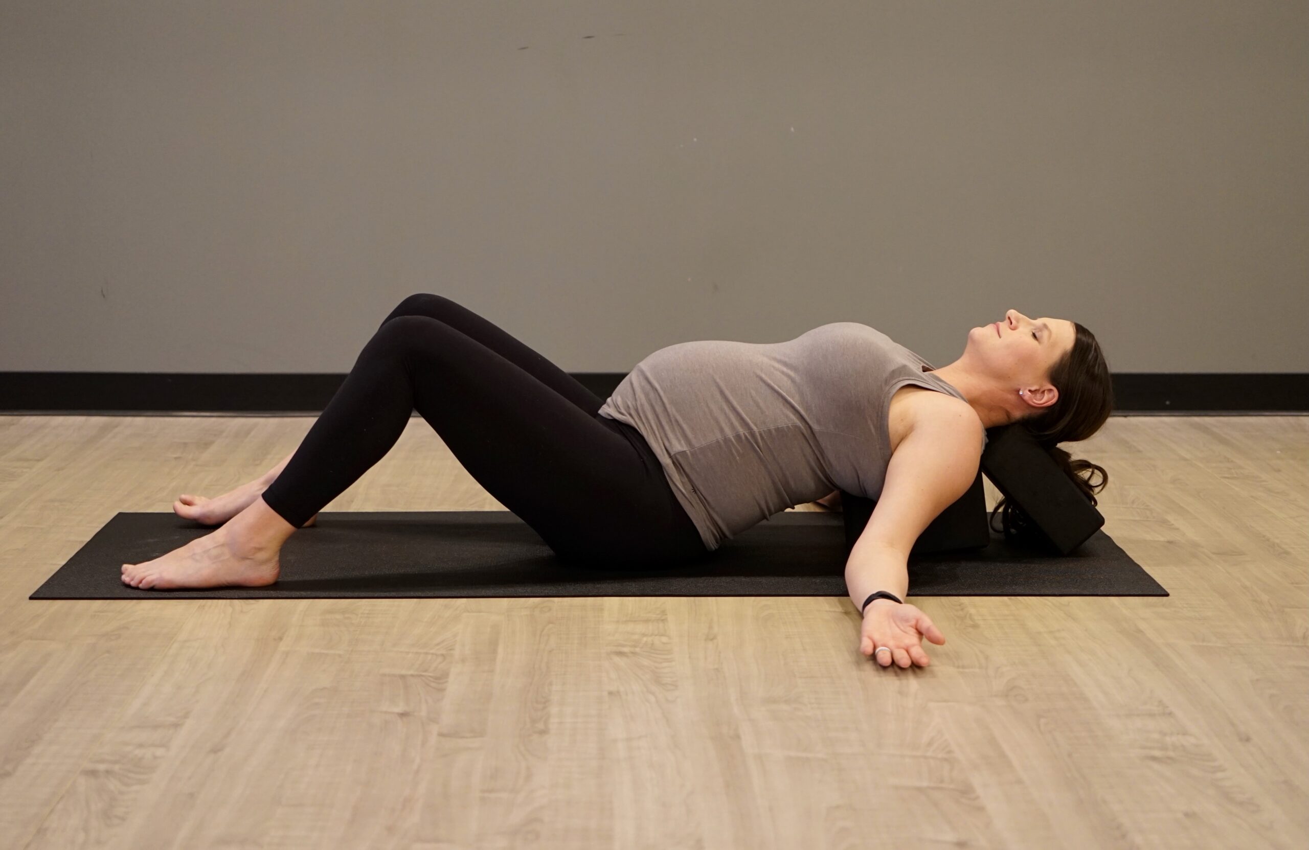 Supported Fish Pose During pregnancy it is common for your chest to get tight. Using two blocks (low or middle height) create a support between your shoulder blades and occipital ridge to gently open your chest. If laying on your back is uncomfortable as pregnancy progresses, avoid this posture.