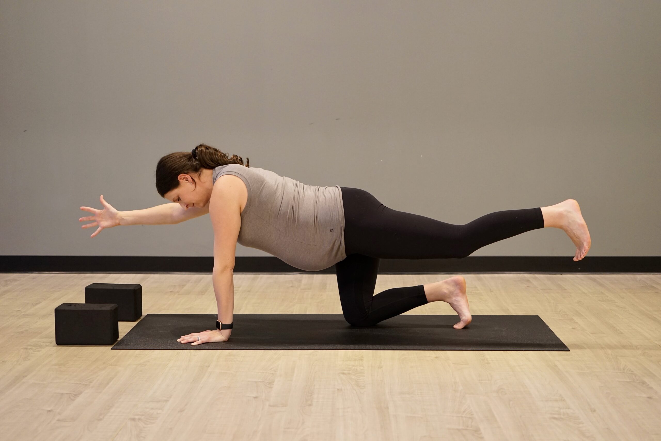 During pregnancy you can develop diastasis recti (DRA)- the separation of your left and right rectus abdominis. This can hinder core recovery postpartum. Avoid crunching postures that limit space for baby and create “coning” in your abdomen. Instead, focus on neutral spine core work. Table top, spinal balance, and modified side plank are great alternatives. Clamshells and bridge pose (alternative for wheel pose) are also great options to build strength and stability.