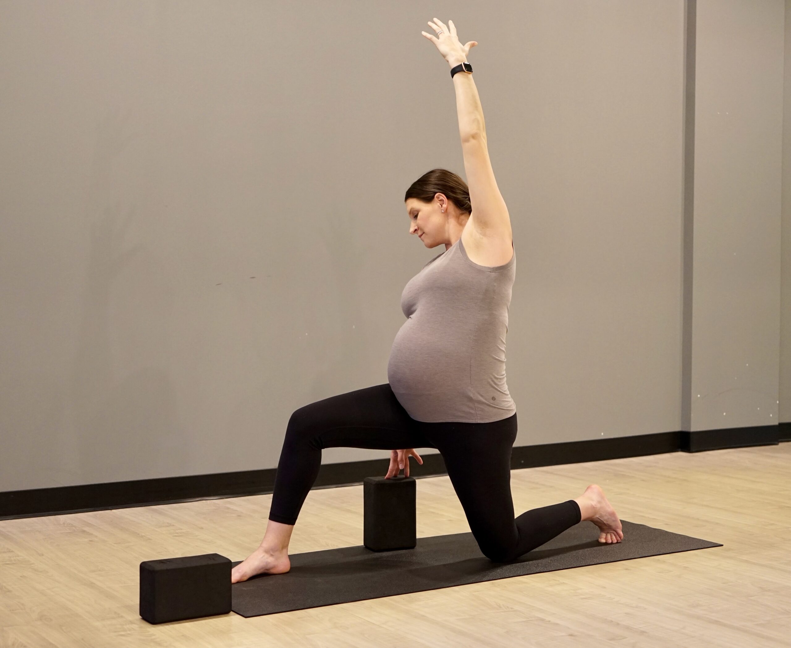 When it comes to pregnancy modifications, twists get a lot of attention-Â rightly so! Due to the growing baby your organs are having to shift into different positions (how cool is that?!) and there is less space overall. Not to mention your center of gravity is constantly changing. Avoid deep twists such as revolved crescent lunge and chair prayer twist. Instead, incorporate a gentle vertical twist with the focus of the twist at your mid spine and above. This can be a great chest opener to counter the rounding inward that occurs during pregnancy. For added support take a hand to your low back. To create even more space you can find an open twist by twisting away from your bent leg – make sure to give your neighbor a quick smile!