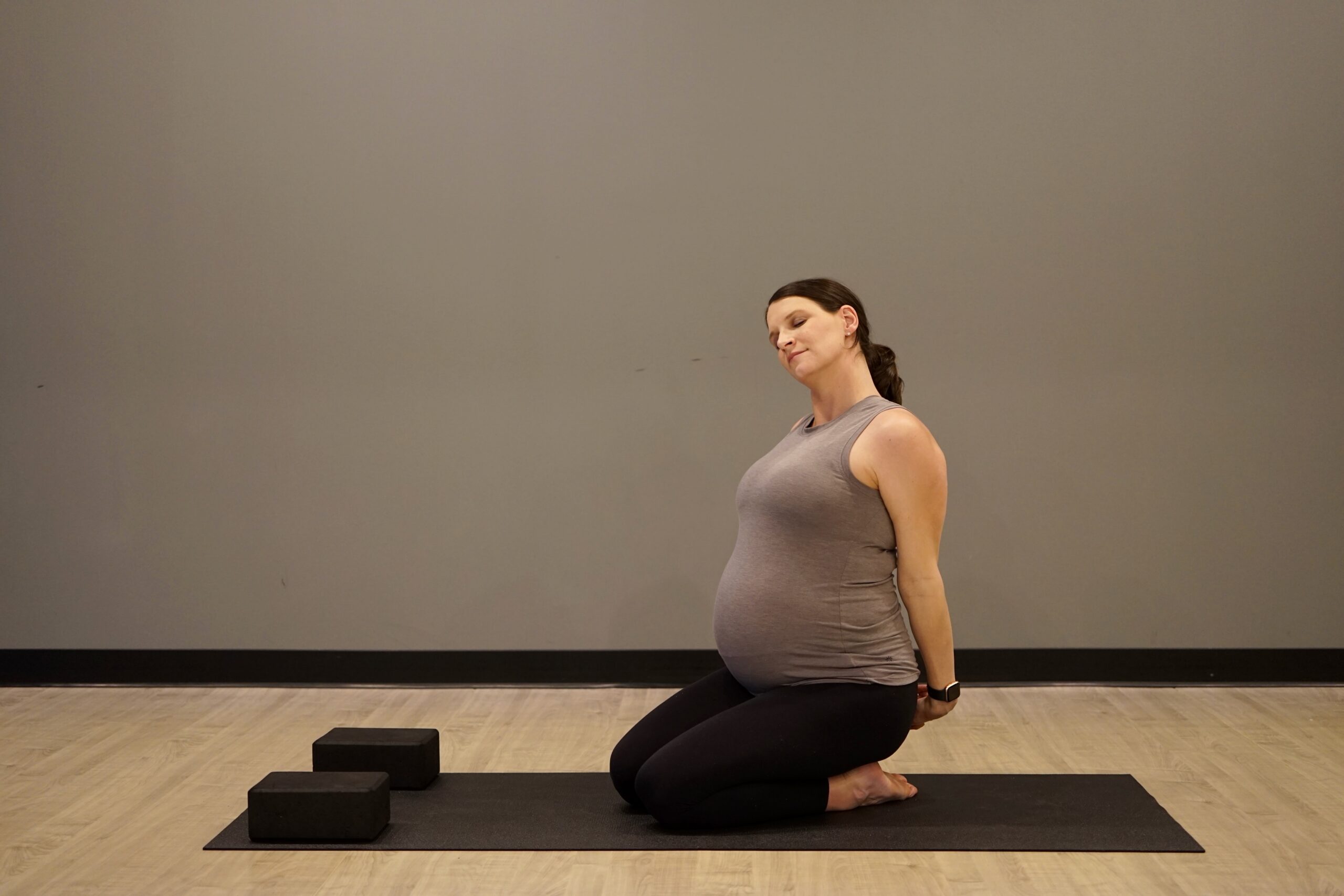In this seated twists, students typically twist towards the bent leg. An open twist (twisting away from the bent leg) allows space for baby, while still allowing for a gentle twist from the mid spine. Use blocks under your hip and hand as needed. Remember, to breathe. If breathing is difficult, you’ve gone too far.