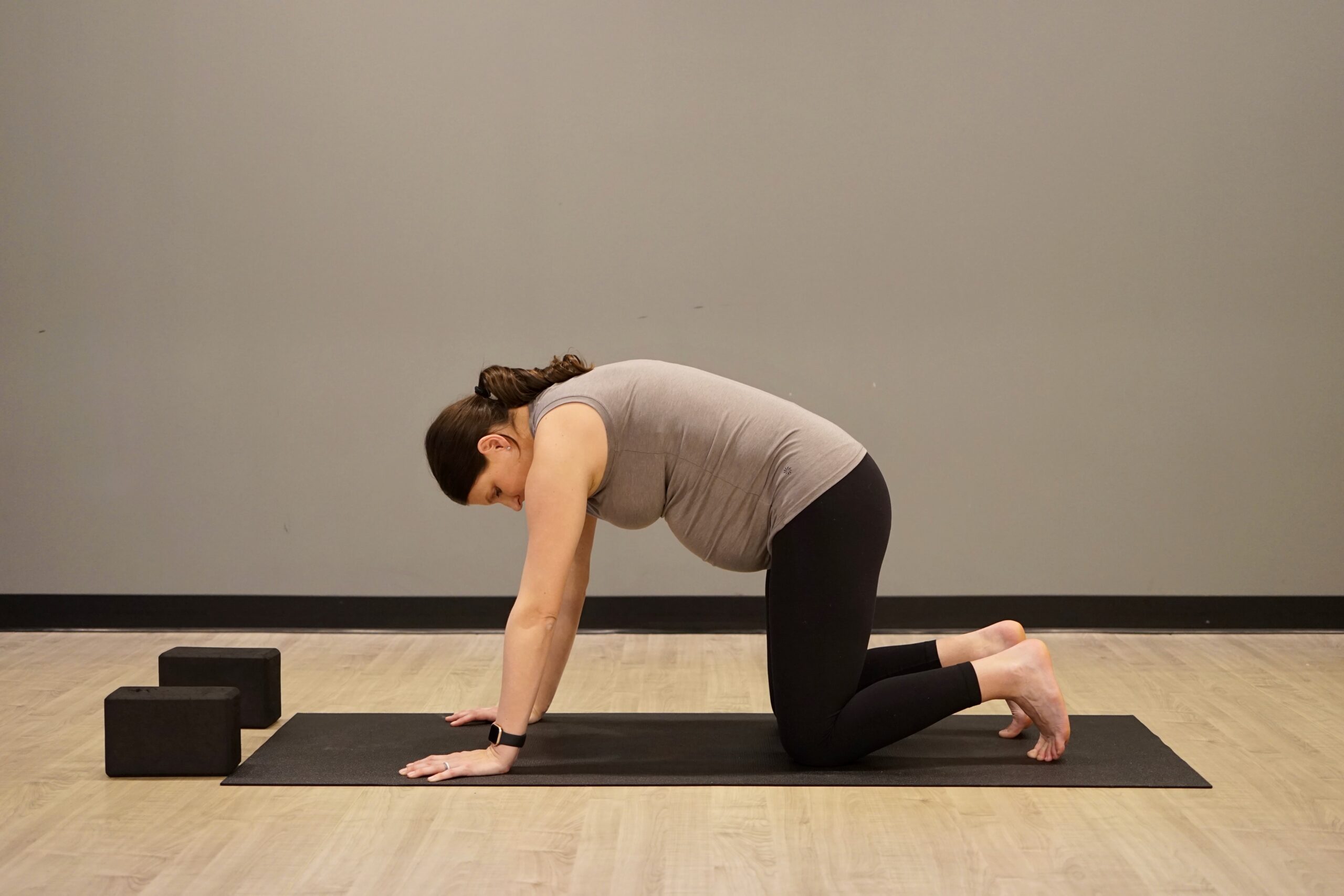 Cow and cat are great postures to warmup the spine and open the chest. In cow pose, allow your belly to be heavy. It is such a relief to get baby off of your back! Draw your shoulder blades together and enjoy length across your collarbones. As for cat pose, the rounding in will continue to decrease as the baby grows. Take this series of postures slow and really feel the movement progress from your tailbone and along each vertebra.